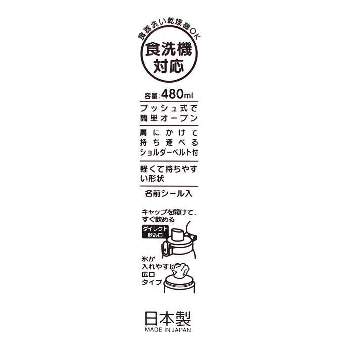 ●セット内容● 水筒 ●実容量● 480ml ●商品サイズ● 幅最長約95mm×高さ約210mm 【品質表示】 ・キャップ:PET/耐熱温度:100度 ・本体、フタ、ベルト止め:ポリプロピレン/耐熱温度:120度 ・パッキン:シリコーンゴム/耐熱温度:140度 ・バネ、ピン:ステンレス 【Made in Japan】 リトルプリンセスルームとは? 当店は、子供ドレス・子供コスチュームを通じて、Happy-世界中のこどもと家族を幸せにする-の理念のもと、2005年に楽天市場へ出店しました。
