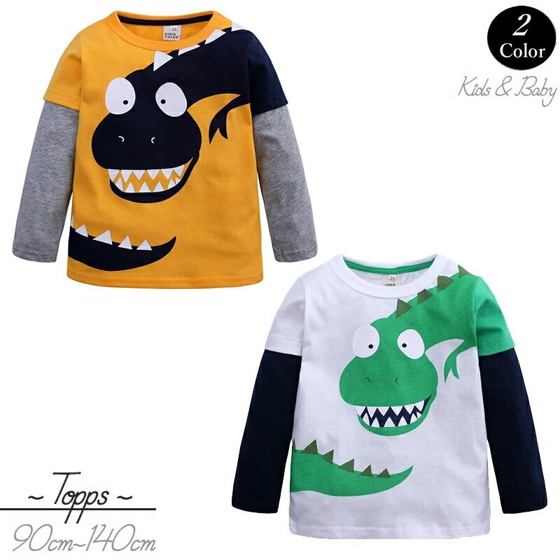 送料無料長袖Tシャツ カットソー キッズ 男の子 女の子 ラウンドネック 重ね着風 恐竜 可愛い 格好いい 90cm 100cm 110cm 120cm 130cm 140cm