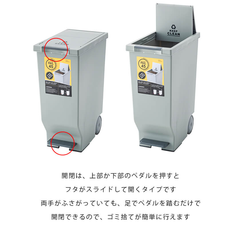 蓋の開閉は、上部か下部のペダルを押すとスライドするタイプです。