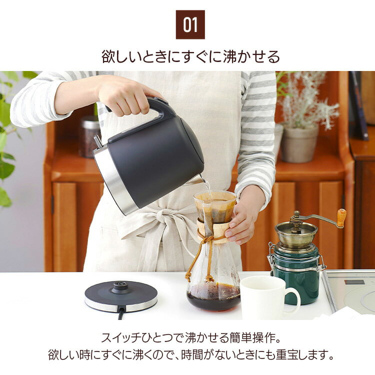 ●商品サイズ(cm)電源プレード含む:幅約21.5×奥行約13.6×高さ約20.0電源プレード含まず:幅約21.5×奥行約13.6×高さ約18.5●質量電源プレード含む:約0.8kg電源プレード含まず:約0.6kg●電源AC100V(50/60Hz共用)●消費電力1200W●湯沸かし容量約1L●コードの長さ約1.3m●主要材質ステンレス、ポリプロピレン(検索用:電気ケトル 電気ポット お湯 湯沸し 湯沸かし ゆわかし 電気ケトル 湯沸し やかん 沸騰 紅茶 ティー コーヒー珈琲 茶 お茶 沸かす 熱湯 4967576431309 4967576446372)★